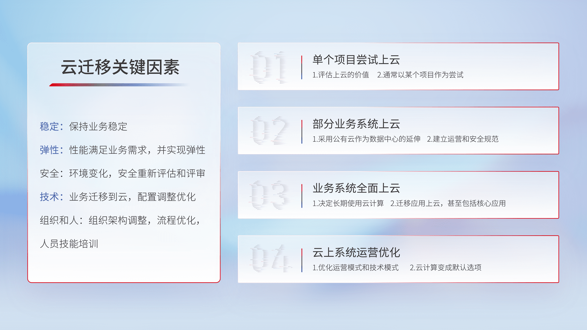 结合实际业务,,,,从规划设计、、、云平台选型、、、、云原生改造、、数据迁移、、、、集成交付,,迁移全过程为客户识别最佳上云路径,,做好风险识别管理,,,,设计网络架构、、、、身份权限、、、、安全审计合规、、、操作审计、、、、日志审计、、监控告警策略、、、、多站点容灾设计等,,,,对云上基础设施进行整体规划,,,提升IT治理水平,,,以满足弹性、、、高可用、、高性能的需求。。。。