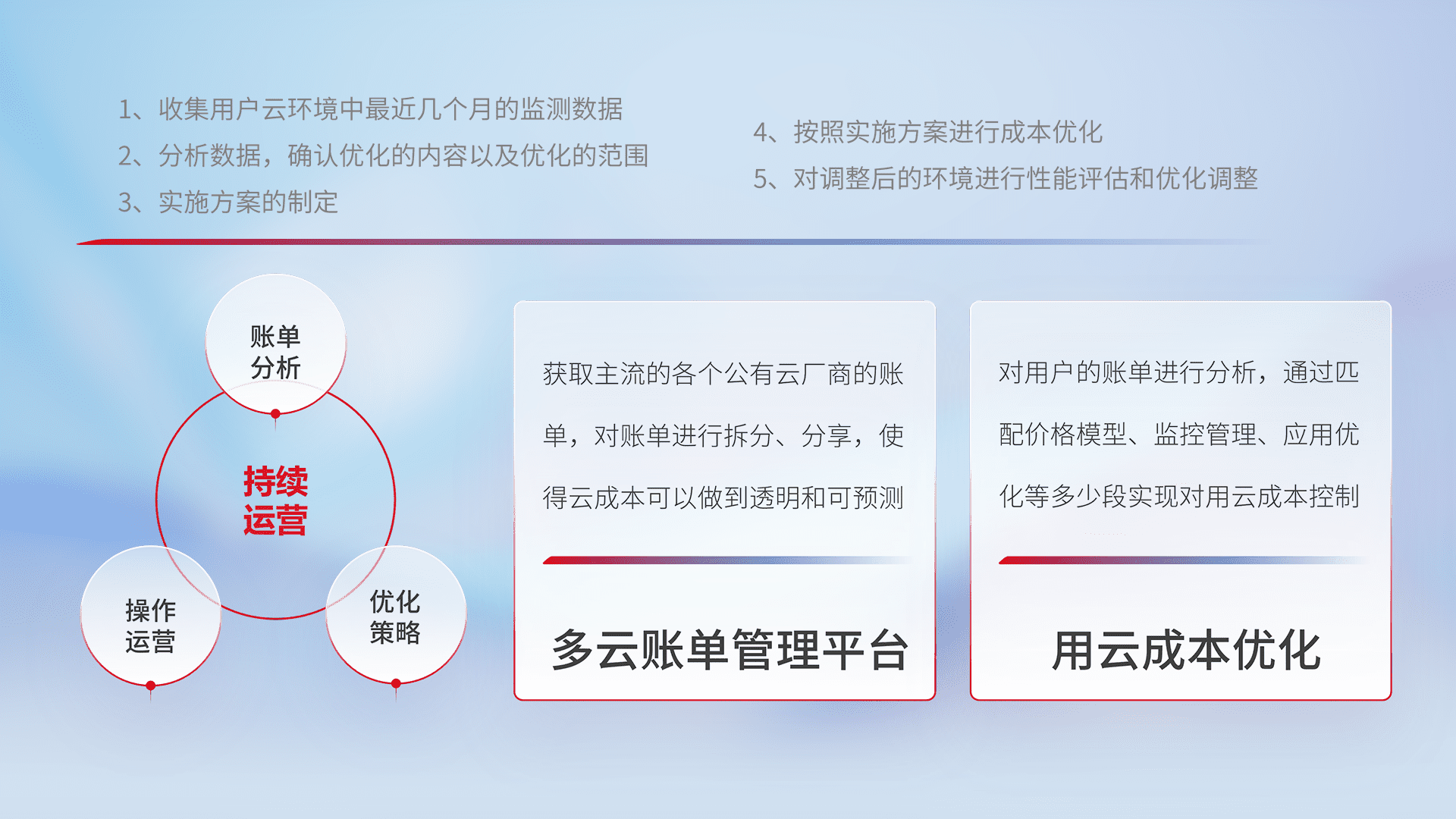 通过多云纳管,,,以统一的资源数据模型把客户的云资源进行抽象和封装,,,,进而实现对多云资源的统一操作,,保障云资源管理的可靠性、、稳定性与可用性。。量身定制化运维内容,,配置、、、开发运维、、补丁管理、、、、备份、、、监控、、、认证和访问管理、、、审计和日常巡检等,,保障在用云过程中的可靠度,,,稳定度以及高可用率。。。
